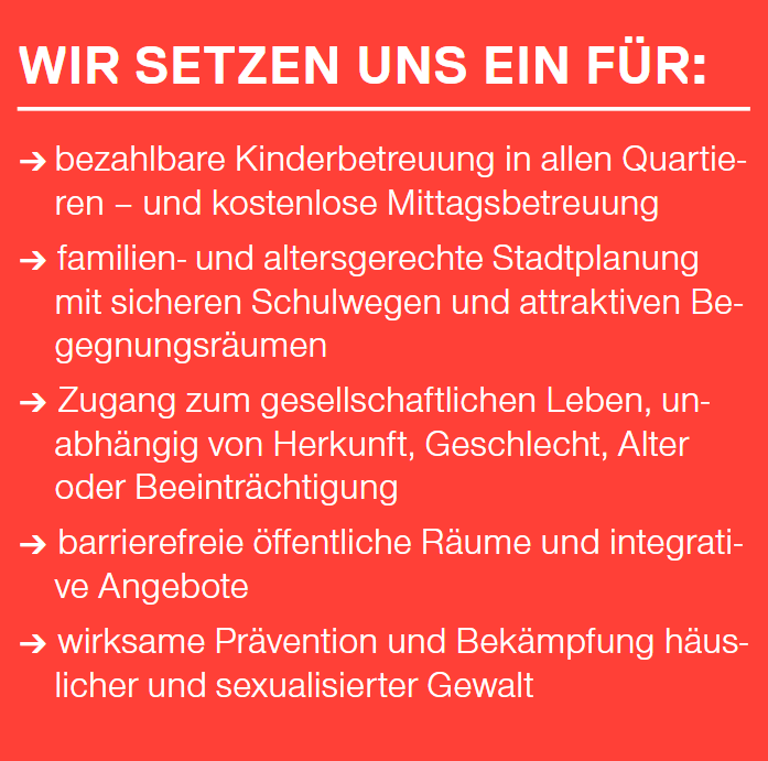 Die Stadt kann handeln: Bezahlbare Kitas und kostenlose Mittagsbetreuung für Schulkinder ermöglichen beiden Elternteilen Erwerbstätigkeit. Eine familienfreundliche, barrierefreie Stadtplanung mit kurzen Wegen erleichtert den Alltag für alle. Wirksame Prävention schützt vor Gewalt.