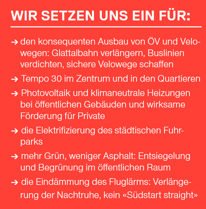 Wir fordern Klimaneutralität bis 2040. Die Stadt muss Vorbild sein und Rahmenbedingungen schaffen: für nachhaltige Mobilität mit starkem ÖV, sicheren Velowegen und verkehrsberuhigten Quartieren statt Autoverkehr. Für mehr Grün statt Asphalt, für mehr erneuerbare Energien statt Öl und Gas.