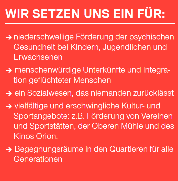 Immer mehr Menschen leiden unter dem Druck steigender Lebenskosten. Mieten, Krankenkassenprämien, Mobilität, alles wird teurer. Unsere Stadt wächst rasant: Wir setzen uns ein für bezahlbare Wohnungen, den Ausbau der Infrastruktur und des Service Public und eine klimaverträgliche Stadtentwicklung. Wir brauchen eine Politik, die nicht nur verwaltet, sondern gestaltet.